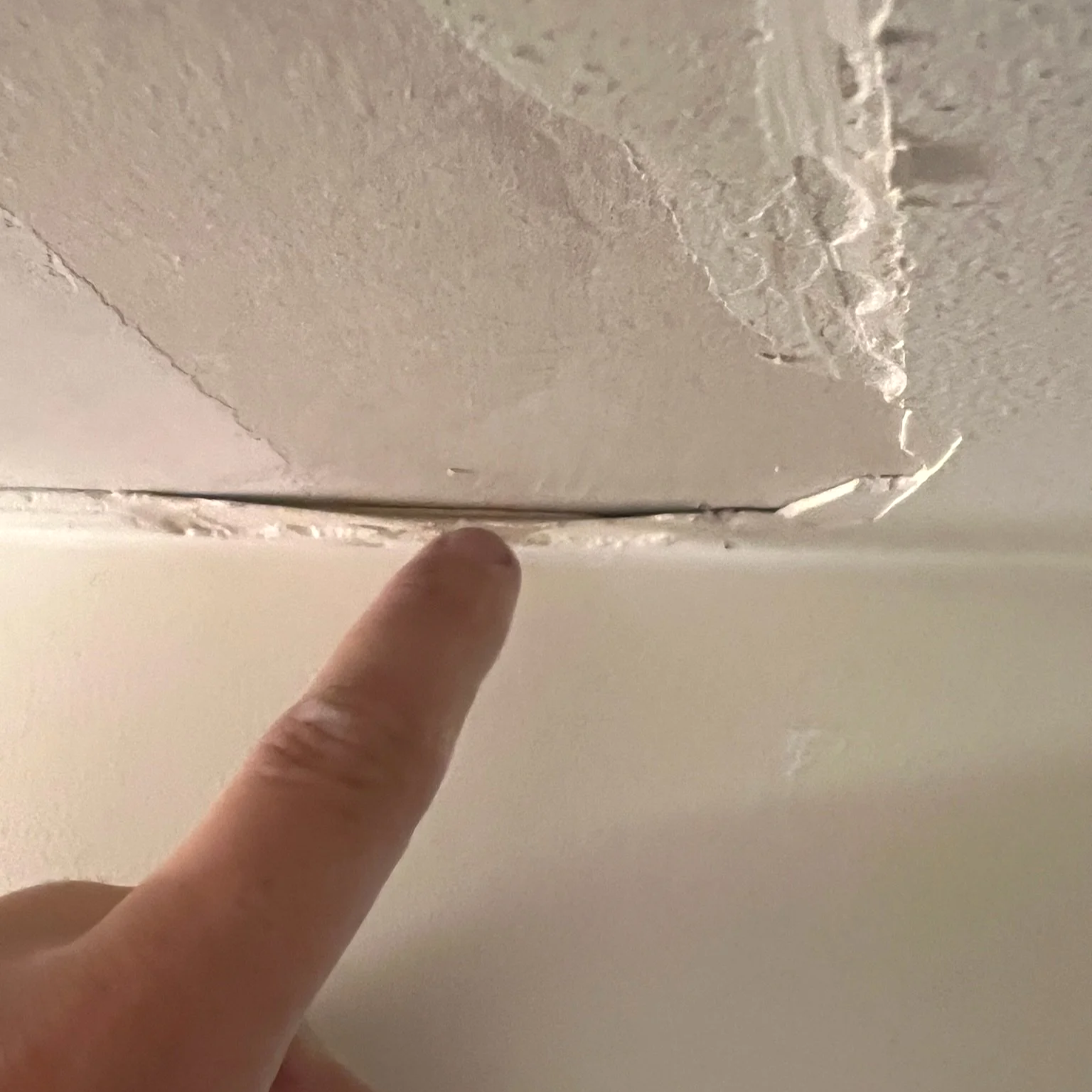 Peeling back bathroom ceiling drywall to reveal much-needed repairs from poor prior work